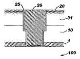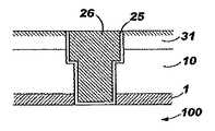 次に、メタライゼーション・プロセス(好ましくは、ライナ25および金属26の付着を含む)を実行し、図18に示される構造を得る。次に、第一の実施の形態におけるのと同様に研磨停止層として機能する層20を用いるCMPプロセスを使用して、過剰な金属と露出したライナとを研磨除去する。過剰な金属を研磨した後(図19)、層20を個別の研磨プロセスで除去して図20に示される構造を得る。CMPによって層31の表面領域31t もまた除去することが望ましい。