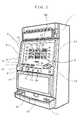スロットマシンの本体部1の前面にはフロントドア2が軸着され、そのフロントドア2のパネル表示部2aには横長矩形の表示窓4L,4C,4Rが設けられ、表示窓4L,4C,4Rには水平に3本、斜めに2本の入賞ライン8が設けられ、これらの入賞ラインは表示窓4L,4C,4Rの左右に設けられている有効化ライン表示ランプ9で結ばれている。これらの入賞ラインは、後述の1−BETスイッチ11、2−BETスイッチ12、最大BETスイッチ13を操作することにより、それぞれ1本、3本、5本が有効化され、有効化された入賞ラインは、有効化ライン表示ランプ9の点灯で表示される。