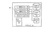 ピアサーバ14は更に、サーチエンジン58、ピアディレクトリ60、イベント/通知エンジン62、キャッシュエンジン64、並びにプレゼンテーションロジック及びリソース66を備えている。検索エンジン58は、様々なピアノード16により受信された要求に応じて、メタデータレポジトリ52内に保管されているメタデータ22全体を検索する。検索エンジン58はまた、ピアノード16上に保管されているメタデータ22を検索するようピアノード16の一つ以上に検索基準をパスすることによって、検索から解放される能力も有する。好ましい実施形態にて、ピアサイトは大量のメタデータ22を有するピアノード16に検索を解放する。このようなピアノード16の例には、従来の中央写真共有サイトがある。  The