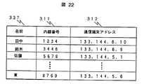 図22は、図19から図21で説明したような交換手端末を利用することによって通話したい通信端末を決定する場合に用いられる通信端末アドレス管理テーブルの構成を示す。内線番号311および通信端末アドレス312の欄は、図18と同じである。337は通信端末を使用するユーザの名前である。電話機の利用者が通話したい者を名前で指定する場合でも、交換手がその名前から通信端末アドレスを検索できるようになっている。  FIG. 22 shows a configuration of a communication terminal address management table used when a communication terminal to be talked is determined by using an exchange terminal as described with reference to FIGS. The fields of the