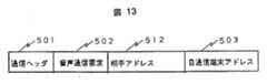 図13は、音声通信要求を行う際に送信される音声通信要求コマンドの構成を示す。501はLAN通信制御部で使用する通信ヘッダ、502は音声通信要求であることを示す識別子、503は当該音声通信要求を送信する通信端末の自通信端末アドレス、512は音声通信を要求する相手の通信アドレスである。通信相手が通信端末の場合は、相手アドレス512としてその通信端末の通信端末アドレスが設定される。そのような音声通信要求コマンドの送り先アドレスは、その通信端末アドレスである。通信相手が電話機の場合は、相手アドレス512としてその電話番号が設定される。そのような音声通信要求コマンドの送り先アドレスは、通信サーバの通信端末アドレスとなる。なお、自通信端末アドレス503は省略しても良い。  FIG. 13 shows a configuration of a voice communication request command transmitted when a voice communication request is made. 501 is a communication header used in the LAN communication control unit, 502 is an identifier indicating that it is a voice communication request, 503 is a communication terminal address of a communication terminal that transmits the voice communication request, and 512 is a partner of a voice communication requester It is a communication address. When the communication partner is a communication terminal, the communication terminal address of the communication terminal is set as the