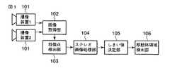 2フレーム目以降の各特徴点には画像処理により求められた視差の値が与えられている。また、前フレームの画像とのブロックマッチングに成功している特徴点については前フレームからの移動速度も与えられている。これらの情報を用いて特徴点集合から移動体上にある特徴点を判別する。まず視差による判別を行うため、ST810で特徴点集合を背景とそれ以外に分けるためのしきい値を決定する。このときのしきい値の決め方としては、前のフレームでの判別結果に従うように決める。すなわち、前フレームにおいて背景であった特徴点は新たなフレームでも背景に、前フレームにおいて背景以外であったならば新たなフレームでも背景以外となるようにしきい値を決定する。これはつまり前フレームの判別結果を教師信号として判別境界を学習していることになる。この学習を実現するための具体的手法の一例を説明する。まずしきいの初期値には0と視差の最大値Dmaxの平均値、もしくは前フレームのしきい値など適当な値を入れておく。さらに学習の度合いを表す定数αの値を決めておく。そして前フレームの判別結果が与えられている特徴点全てについて、現時点でのしきい値の大小で判定を行い、前フレームの判別結果と一致するかを確認する。一致するならば、しきい値はそのままとし、誤った判別がされた場合に限り、しきい値を修正する。修正の仕方は判別を誤った特徴点の視差をd、このときのしきい値をT、新たなしきい値をT’とすると、背景となるべき特徴点が背景以外と判別された、つまりしきい値が小さすぎた場合は、T’=T+αdとする。逆に大きすぎた場合はT’=T−αdと修正する。これを前フレームの判別結果が与えられている特徴点全てについて一定回繰り返す。もし全ての特徴点で誤りが無くなればその時点で終了する。そうでなくても一定回繰り返した後に終了する。これにより視差のしきい値が決定する。なお、説明したしきい値決定の手法はあくまで一例に過ぎず、教師付きの学習の手法であればどれでも利用可能である。Each feature point in the second and subsequent frames is given a parallax value obtained by image processing. Further, the moving speed from the previous frame is also given to the feature points that have succeeded in block matching with the image of the previous frame. Using these pieces of information, the feature points on the moving object are discriminated from the feature point set. First, in order to perform discrimination based on parallax, a threshold for dividing the feature point set into the background and the other is determined in ST810. As a method of determining the threshold value at this time, it is determined so as to follow the determination result in the previous frame. That is, the threshold value is determined so that the feature point that is the background in the previous frame is the background even in the new frame, and if it is other than the background in the previous frame, the feature point is also other than the background. That is, the discrimination boundary is learned using the discrimination result of the previous frame as a teacher signal. An example of a specific method for realizing this learning will be described. First, an appropriate value such as an average value of 0 and the maximum parallax value Dmax or a threshold value of the previous frame is set as the initial threshold value. Further, a value of a constant α representing the degree of learning is determined. Then, all the feature points to which the determination result of the previous frame is given are determined based on the current threshold value, and it is confirmed whether or not it matches the determination result of the previous frame. If they match, the threshold value is left as it is, and the threshold value is corrected only when an erroneous determination is made. As for the correction method, if the parallax of the feature point that is misidentified is d, the threshold value at this time is T, and the new threshold value is T ′, the feature point that should be the background is determined to be other than the background. If the threshold is too small, T ′ = T + αd. Conversely, if it is too large, it is corrected to T ′ = T−αd. This is repeated a certain number of times for all feature points for which the discrimination result of the previous frame is given. If there are no errors in all feature points, the process ends at that point. Otherwise, it ends after repeating a certain number of times. Thereby, the parallax threshold is determined. Note that the threshold value determination method described above is merely an example, and any learning method with a teacher can be used.