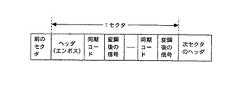 図8は、図5のデータエリア部分に含まれるセクタの構造を説明する図である。図8の1セクタは図7のセクタ番号の1つに対応し、図2に示すように2048バイトのサイズを持つ。各セクタはディスク10にエンボスで刻まれたヘッダを先頭に、同期コードと変調後の信号(ビデオデータその他)を交互に含んでいる。  FIG. 8 is a diagram for explaining the structure of sectors included in the data area portion of FIG. One sector in FIG. 8 corresponds to one of the sector numbers in FIG. 7, and has a size of 2048 bytes as shown in FIG. Each sector includes a header engraved on the