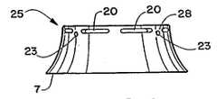 本発明の他の態様において、可撓性吸引体が総括的形状として、蹄鉄形をなしている。この態様において、可撓性吸引体は、蹄鉄形ベースを含み、治療部位を露出させる開口部を規定する吸引路と、このベースの周縁に沿って形成された連続的リムと、吸引路内に部分的真空を適用するための吸引ポートと、部分的真空が吸引路に保たれた状態で、流体を治療部位から除去するための少なくとも1つの排液孔とを具備してなる。ここで、ベースの外側周縁に沿って設けられたリムの部分は漏斗状をなし、拡張可能になっている。このベースが蹄鉄形の場合、開口部の寸法は楕円形ベースにより形成されたものとほぼ同一であるが、図7から図9に25で示すように、楕円形は長手軸の1端部で開口し、上記の吸引路の内側および外側リムが蹄鉄形状の端部の周りに現われる。