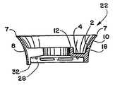 この例においては、吸引路2は完全にドーナツ形空間ではなく、内側リム12と同じ高さを有し、ベース4に沿って漏斗状の外側リム10と内側リム12との間に延出する補強部材30により遮られている。漏斗状の外側リムの垂直高さ(ベースの面からその先端までの高さ)は内側リムの高さよりも大きい。外側リムはその厚みが徐々に薄くなっていて、ベースへの取着点で最も厚く、先端部が最も薄くなっている。更に、図10に示すように、吸引体を治療部位に対し保持させ、外側リム7の先端を治療部位に当て、部分的真空を吸引ポートを介して吸引路に導入すると、吸引路で発達した部分的真空により、吸引体が治療部位に向けて引張られ、そのとき、可撓性の外側リムの先端部が平らになり、内側リムが治療部位の表面と接触するようになるまで治療部位の表面に沿って外側に拡張する。従って、吸引により治療部位の表面に取着されたとき、外側リムの先端は、治療部位に取着される前の外側リムにより描かれる円形よりも実質的に大きい周縁の円を描くものとなる。