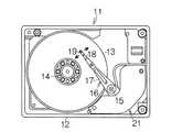 こうした浮上ヘッドスライダ19の浮上中に、キャリッジ16が支軸15回りで揺動すると、浮上ヘッドスライダ19は半径方向に磁気ディスク13の表面を横切ることができる。こうした移動に基づき浮上ヘッドスライダ19は磁気ディスク13上の所望の記録トラックに位置決めされる。このとき、キャリッジ16の揺動は例えばボイスコイルモータ(VCM)といったアクチュエータ21の働きを通じて実現されればよい。周知の通り、複数枚の磁気ディスク13が筐体本体12内に組み込まれる場合には、隣接する磁気ディスク13同士の間で1本の揺動アーム17に対して2つの弾性サスペンション18が搭載される。