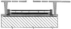 本発明の別の観点は、一連のノズルチャンバを有するインクジェット印字ヘッド装置の製造方法の提供である。この方法は以下のステップから構成される:(a)その上に電気回路層が形成された初期半導体ウエハを使用し、後の層と回路の連結のためのエッチングされたビアを含む、(b)電子回路層の上に一連の平面層を繰り返し配置する。平面層は第1導電性層、第2導電性層、中間の圧縮性非導電層を含む、(c)一連の交互に積み重ねられた構造を形成するために平面層をエッチングする、(d)交互に積み重ねられた構造の少なくとも一つの第1端部を隔離する、(e)第1導電性層を露出させるために、第2導電性層と中間の圧縮性層を該端部に沿ってエッチングする、(f)交互に積み重ねられた構造の第2の端部を隔離する、(g)第2導電性層を露出させるために、第1導電性層と中間の圧縮性層を第2の端部に沿ってエッチングする、(h)第1の端部に沿って第1導電性層と相互連結している第1部分と、第2の端部に沿って第2導電性層と相互連結している第2部分を有する第3導電性層を配置し、エッチングする、第1と第2の部分は電気回路層中の対応する部分と相互接続している、(i)ウエハ上に犠牲材料層を配置し、エッチングする、エッチングは後のノズルチャンバ層のための型(モールド)を形成する、(j)インク排出穴に加えて、導電性層を取り囲むノズルチャンバを形成するために、犠牲層上に不活性材料層を配置し、エッチングする、(k)ノズルチャンバと相互連結するためにウエハの一部を介してインク供給溝をエッチングする、(l)犠牲材料層をエッチング除去する。 Another aspect of the present invention is the provision of a method for manufacturing an inkjet printhead device having a series of nozzle chambers. The method comprises the following steps: (a) using an initial semiconductor wafer on which an electrical circuit layer is formed, and including etched vias for connection of subsequent layers and circuits, (b) ) Repeatingly arranging a series of planar layers on the electronic circuit layer. The planar layer includes a first conductive layer, a second conductive layer, and an intermediate compressible non-conductive layer, (c) etching the planar layer to form a series of alternating stacked structures, (d) Isolating at least one first end of the alternately stacked structure; (e) a second conductive layer and an intermediate compressible layer along the end to expose the first conductive layer; Etching, (f) isolating the second end of the alternately stacked structure, (g) second conductive layer and intermediate compressive layer second to expose the second conductive layer. (H) a first portion interconnected with the first conductive layer along the first end, and a second conductive layer along the second end; Disposing and etching a third conductive layer having a second portion interconnected, the first and second portions corresponding in the electrical circuit layer (I) a sacrificial material layer is placed on the wafer and etched, etching forms a mold for a later nozzle chamber layer, (j) in the ink drain holes In addition, an inert material layer is disposed and etched on the sacrificial layer to form a nozzle chamber surrounding the conductive layer, (k) ink through a portion of the wafer to interconnect with the nozzle chamber (1) Etch away the sacrificial material layer.