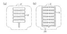 図2(a)(b)にそれぞれ示されるように、これら静電容量センサ部12及び着座センサ部13は、シートクッション2の着座面に沿って広がる態様で収容配置されている。これら静電容量センサ部12及び着座センサ部13の平面形状は互い違いに突出する櫛歯形状を有しており、後述するようにこれらを上下に重ね合わせたときに1枚のフィルムシートの形状をなす。これら静電容量センサ部12及び着座センサ部13は、共に同一の積層構造を有している。  As shown in FIGS. 2A and 2B, the electrostatic