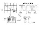 次に、気象データ取得部33により、各種の気象データが取得される(ステップS114)。そして、気象データ解析部44は、得られた気象データを解析し、所定面積単位に区分された各地域の所定時間毎(本実施形態では3時間毎)の天気の予測値を示す格子気象データテーブルを生成する(ステップS115)。図8に、気象データ解析部44により得られた3時間毎の天気の予測値を示す格子気象データテーブル212a〜212cを示す。各テーブル212a〜212cは、それぞれ、12時〜15時,15時〜18時,および18時〜21時の各時間における各格子領域の天気の実況値または予測値を示している。このテーブル212中においても、第1実施形態と同様に、1は晴れ,2は曇り,3は雨を表している。なお、このテーブル212の各格子領域は、分布図211の各格子領域に対応しているものとする。