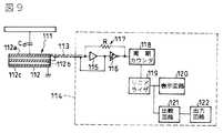 ここで検知電極112aに、接地された物体が近接すればその間の静電容量Cdが増加する。バッファ回路115とシュミットトリガインバータ116はこの静電容量Cdと帰還抵抗Rを時定数として発振する発振回路117を構成しており、その出力は周期カウンタ118に接続される。周期カウンタ118は発振回路の発振周期を測定するものであって、その出力はリニアライザ119に与えられる。リニアライザ119は周期の変化を物体までの距離に対する変化として直線化するものである。リニアライザ119の出力は表示回路120及び比較回路121に入力される。比較回路121は入力信号を所定の閾値で弁別するものであり物体の有無の判別信号として出力回路122により出力される。