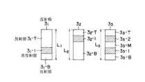(3) 反射板33では、反射エリアのうち反射板31の非反射部31-1と同じ位置に下段の非反射部33-1を形成し、反射板32の非反射部32-1と同位置に上段の非反射部33-2を形成し、残る上側部分、下側部分、及び、上下段非反射部33-1、33-2間部分の全てに反射部33-T、33-B、33-Mを形成してある。