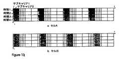 図1Aは、サブキャリア101のような複数のサブキャリアとクラスタ102を示している。クラスタ102のようなクラスタは、図1Aに示すように、少なくとも1つの物理的サブキャリアを保有している論理ユニットとして定義される。クラスタは、連続した又はばらばらのサブキャリアを保有することができる。クラスタとそのサブキャリアの間のマッピングは、固定されていても再構成可能であってもよい。後者の場合、基地局は、加入者に何時クラスタが再定義されるかを通知する。或る実施形態では、周波数スペクトルは512個のサブキャリアを含んでいて、各クラスタは4個の連続したサブキャリアを含んでおり、結果的に128個のクラスタとなる。 FIG. 1A shows a plurality of subcarriers such as subcarrier 101 and a cluster 102. A cluster, such as cluster 102, is defined as a logical unit possessing at least one physical subcarrier, as shown in FIG. 1A. A cluster can have contiguous or disjoint subcarriers. The mapping between a cluster and its subcarriers may be fixed or reconfigurable. In the latter case, the base station informs the subscriber when the cluster will be redefined. In some embodiments, the frequency spectrum includes 512 subcarriers, and each cluster includes 4 consecutive subcarriers, resulting in 128 clusters.