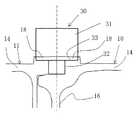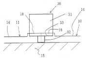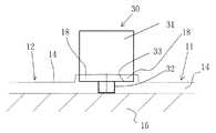 板厚が薄い個所の接合部Bでは、小径部32と大径部31との境33を面板の上面から2mm上方に位置させ、摩擦攪拌接合を行う。挿入した回転工具30の挿入力は凸部18,18から、接続板16、凸部18,18を介して治具15に伝えられる。In the joint portion B where the plate thickness is thin, the