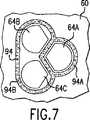 開口部64A,64B,64Cは、2つの平らな側面を円弧部で接続したパイ、すなわち扇形の開口部である。これら開口部は、各開口部の平らな側面が他の開口部の平らな側面に隣接するような向きになっている。この構成によって、依然として開口部同士間のノーズピース材料の適度な面積は、接着剤の塗布に備えることが可能でありながら、開口部を通る流動面積(flow area)が最大になる。