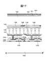 図11及び図12における断面A-A'、断面B-B'、断面C-C'、断面D-D'、断面E-E'を夫々図13、図14、図15、図16、図17に示す。図17だけは、液晶層166及び基板163も含んだ断面図であり、他はアクティブマトリクス側の基板150の断面図である。図14ないし図16において、4層の金属配線151、152、144、146が、その層間に絶縁膜147、148、149を介して積層されている。  11, FIG. 15, FIG. 16, FIG. 16, the cross section AA ′, the cross section BB ′, the cross section CC ′, the cross section DD ′, and the cross section EE ′ in FIG. 11 and FIG. 17 shows. 17 is a cross-sectional view including the