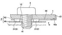そして、図3又は図4のように、コーナ部を支持片42の基準支持面42aに載架したプリント基板1のねじ挿通孔12に頭付き締付けねじ5を挿通させてその頭付き締付けねじ5を締付け片46のねじ孔41にねじ込んで締め付けてある。また、頭付き締付けねじ5の締付け力によって、図5に矢印aで示したように締付け片46を仮想線の位置から実線の位置まで変形させて半田盛りパターン2に圧接させている。この場合の頭付き締付けねじ5の締付けトルクは、締付け片46が圧接した半田盛りパターン2の半田21が少し押し潰される程度の強さであり、その程度の強さにしておくと、半田盛りパターン2を介してプリント基板1が締付け片46に確実に電気的に接触して良好な電気的導通信頼性と電気的接続安定性とが確保される。  Then, as shown in FIG. 3 or FIG. 4, the headed tightening