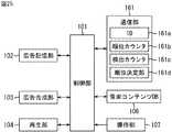 1, 1-1, 1-2, 1-11, 1-21, 1-31 to 1-34 stores, 11, 11 ′, 11-11 to 11-13, 11-31 to 11-34 mobile terminals, 12, 12-1, 12-2, 12-11, 12-21, 12-22, 12-31 to 12-34 distribution device, 21 area, 101 control unit, 102 advertisement storage unit, 103 advertisement composition unit, 104 Playback section, 105 communication section, 105a ID, 106 music content DB, 107 operation section, 121 control section, 122 advertisement storage section, 123 communication section, 123a ID, 131 advertisement composition section, 131a composition history, 141 advertisement composition section, 141a Usable number counter, 151 Advertisement composition unit, 151a No advertisement counter, 161 Communication unit, 161a ID, 161b Rank counter, 161c Detection counter, 1 1d rank determination unit, 171 communication unit, 171a ID, 171b clock, 181 transfer unit, 181a ID, 191 communication unit, 191a ID, 191b traveling direction confirmation unit, 201 transfer unit, 201a ID, 201b clock, 211 communication unit, 211a ID, 211b Strength detector