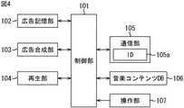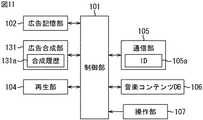 制御部101は、携帯端末11の全体の動作を制御する。広告記憶部102は、制御部101により制御され、通信部105を介して配信装置12より配信される広告データを記憶する。広告合成部103は、音楽コンテンツを再生するとき、音楽コンテンツDB(データベース)106から読み出された音楽コンテンツに、広告記憶部102より読み出された広告データを合成し、再生部104に出力する。再生部104は、広告合成部103より供給された、広告データが合成されている音楽コンテンツ、または、広告データが合成されていない音楽コンテンツを再生し、スピーカなどから出力させる。