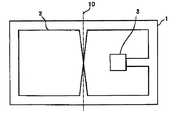 図3は、図2に示すICカード1を折り畳み線10で2つに折曲げたところを示した図である。このICカード1は、広げている場合には1個のアンテナコイル2が存在し、所定の通信周波数で通信可能であるが、折り畳み線10で2つに折った場合、左右のコイル2のパターンが重なり合い、コイルの開口部の面積が小さくなる。コイル2のインダクタンスは、この開口部の面積に比例して大きくなるため、この場合はインダクタンスが小さくなる。完全にコイルが重なった場合には、理論上、インダクタンスは0となる。このため、アンテナコイル2が交流磁界より受ける信号は小さくなり、ICチップ3を働かなくすることができ、通信不可(通信周波数=0)となる。
