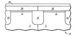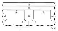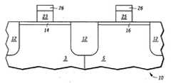 一実施例では、フィールド分離領域12は、トレンチ分離領域であり、従来のエッチングおよび化学機械式研摩技法を用いて形成する。あるいは、フィールド分離領域12は、シリコン選択酸化(LOCOS),ポリ・バッファLOCOS(BPL),ポリシリコン封入選択酸化(PELOX)等のような従来からの技法を用いて形成したフィールド酸化物領域とすることも可能である。一実施例では、ゲート誘電体層14およびゲート誘電体層16は、熱二酸化シリコン層であり、第1領域3の一部分および第2領域5の一部分をそれぞれ熱的に酸化させることによって形成する。あるいは、ゲート誘電体層14およびゲート誘電体層16は、窒化シリコンの層,酸窒化シリコンの層,化学蒸着した二酸化シリコンの層,窒化した酸化物層(nitrided oxide layer),金属酸化物のような高−k誘電体物質,またはその組み合わせとすることも可能である。尚、ゲート誘電体層14およびゲート誘電体層16は同時に形成可能であることは認められよう。あるいは、ゲート誘電体層14およびゲート誘電体層16は、異なる時点に、異なるゲート誘電体物質で形成することも可能である。