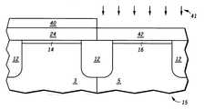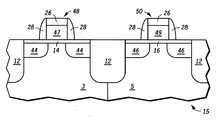 図8に、本発明の別の実施例を示す。ここでは、導電性窒化物層24を形成した後に、図4に示したマスキング層20を除去する。次に、導電層18の残り部分を露出させるように、導電性窒化物層24上に第2マスキング層40を形成する。一実施例では、マスキング層40は窒化シリコンの層であり、急速熱化学蒸着を用いて堆積する。あるいは、マスキング層40はフォトレジストの層またはポリシリコンの層とすることも可能である。マスキング層40を形成した後、次いで導電層18の残り部分を窒化して導電性窒化物層42を形成する。一実施例では、導電層18の残り部分に窒素イオン41を注入し、次いで半導体素子構造15をアニールし、導電性窒化物層42を形成する。あるいは、アンモニアのような窒素雰囲気において導電層18の残り部分をアニールすることによって、または導電層18の残り部分を、窒素を含むプラズマに露出させることによって、導電性窒化物層42を形成することも可能である。尚、導電層18がタンタル,タングステン,モリブデン,ジルコニウム,ハフニウム,バナジウム,クロム,ニオブ,またはチタンの層である場合、導電性窒化物層42は、それぞれ、窒化タンタル,窒化タングステン,窒化モリブデン,窒化ジルコニウム,窒化ハフニウム,窒化バナジウム,窒化クロム,窒化ニオブ,または窒化チタンの層となることを注記しておく。同様に、導電層18がタンタル・シリサイド,タングステン・シリサイド,モリブデン・シリサイド,またはチタン・シリサイドの層である場合、導電性窒化物層42は、それぞれ、窒化タンタル・シリコン,窒化タングステン・シリコン,窒化モリブデン・シリコン,または窒化チタン・シリコンとなる。