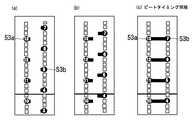 また、制御部1は、インタフェイス画面生成用コード8bに従って、図10に(a),(b)に示すように、楽音データ11の再生位置に従ってビート番号等の表示内容を更新して生成、消滅を繰り返しながら、二つの楽音データ11に関するビートガイドオブジェクト52a,52bを再生速度に合わせ再生ライン49a方向に一定速度Aで移動表示する。また、制御部1は、レコードオブジェクト50a,50bの再生ライン51a,51bも移動表示し、ユーザが楽音データ11全体の再生時間内における再生位置を視覚的に認識できるようにする。
