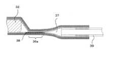本実施形態のフィルム外装電池31は、第2の実施形態と比較して、ガス開放部37にチューブ39を接続した点が異なる。その他、圧力開放構造として、熱融着部36の一部に応力集中部として突出融着部36aが形成されていること、外装フィルム34が熱融着されていない空間であるガス開放部37が、突出融着部36aに先端部を臨ませて形成されていること、突出融着部36aを含む領域において2枚の外装フィルム34のうち一方の熱融着樹脂層に架橋構造部38を形成すること等は、第2の実施形態と同様である。  The film-clad