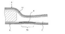 熱融着部6には前述した突出融着部6aが形成されているので、引き剥がし応力は、この突出融着部6aに集中し、外装フィルム4,5の剥離は突出融着部6aで優先的に進行する。突出融着部6aは、図3に明確に示すように、外装フィルム5の架橋構造部8と外装フィルム4の熱融着樹脂層11とが熱融着された領域である。架橋構造部8は、熱融着樹脂層11と比べて高温で軟化しにくく、両者を熱融着しても架橋構造部8と熱融着樹脂層11とは完全には一体化せず、架橋構造部8と熱融着樹脂層11との間に境界が存在している。ここで、「高温で軟化しにくい」とは、例えば樹脂を一定の応力で加圧しながら昇温させたときの温度−ひずみ特性、いわゆるクリープ曲線において、横軸を温度としたときにそのクリープ曲線の傾きが小さくなることをいう。  Since the protruding