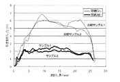 これらサンプルおよび比較サンプルをそれぞれ2つずつ作製し、熱融着されていない部分をチャックして、熱融着された部分を180°方向に引き剥がしていき、そのときに作用する力を測定した。その測定結果を図5に示す。なお、図5において、横軸は引き剥がし長さを示しているが、これはチャック間の距離を意味している。したがって、この引き剥がし長さは、実際には外装フィルムの延びも含まれており、熱融着部が完全に引き剥がされた際のチャック間の距離は約25mmとなっている。図5から明らかなように、サンプル1,2は、比較サンプル1,2と比較して全般的に小さな引き剥がし力で剥離している。すなわち、対向する外装フィルムの界面に架橋構造層が存在することで、剥離強度が小さくなる。  Two each of these samples and comparative samples were prepared, the non-heat-sealed part was chucked, the heat-fused part was peeled off in the 180 ° direction, and the force acting at that time was measured. . The measurement results are shown in FIG. In FIG. 5, the horizontal axis indicates the peeling length, which means the distance between chucks. Therefore, the peeling length actually includes the extension of the exterior film, and the distance between the chucks when the heat-sealed portion is completely peeled is about 25 mm. As is clear from FIG. 5, the