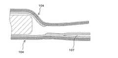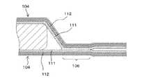 図14は、図13に示したフィルム外装電池の、ガス開放部での断面図である。図14に示すように、外装フィルム104は、熱融着樹脂層111同士を対面させて配され、熱融着部106においては、熱融着樹脂層111同士が熱融着によって一体化されている。熱融着樹脂層111の外側の層は金属層112である。この状態でフィルム外装電池の内圧が上昇すると、外装フィルム104の引き剥がし応力が熱融着部106の内縁に加わり、外装フィルム104の剥離が、熱融着樹脂層111を破壊しながら進行する。  14 is a cross-sectional view of the film-clad battery shown in FIG. 13 at the gas release portion. As shown in FIG. 14, the