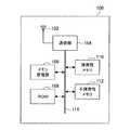 ここで、図1を参照しながら、通信デバイス100の構成について説明する。通信デバイス100は、主に、アンテナ102と、通信部104と、メモリ管理部106と、ROM(Read  Only  Memory)108と、揮発性メモリ110と、不揮発性メモリ112と、CPU(Central  Processing  Unit)116と、を備えている。  Here, the configuration of the