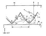 また、指向性光出射機能部が付与されていない他の主面には、導光体3からの出射光の光源1と平行な面(YZ面)での指向性を制御するために、光入射面31に対して略垂直の方向(X方向)に延びる多数のレンズ列を配列したレンズ面を形成することが好ましい。図1に示した実施形態においては、光出射面33に粗面を形成し、裏面34に光入射面31に対して略垂直方向(X方向)に延びる多数のレンズ列の配列からなるレンズ面を形成している。本発明においては、図1に示した形態とは逆に、光出射面33にレンズ面を形成し、裏面34を粗面とするものであってもよい。