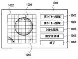 第1のパターン領域を設定したい場合は、第1パターン領域設定ボタン1003をマウスでクリックすると、第1のパターン領域設定モードとなり、この状態において編集領域1002の1つの格子枠1007をクリックすると、格子枠1007は、例えば赤で塗りつぶされる。同様に、第1のパターン領域を設定したい格子枠をマウスでクリックすることで、次々に第1のパターン領域を設定することができる。次に、第2のパターン領域を設定したい場合は、第2パターン領域設定ボタン1004をマウスでクリックすると、第2のパターン領域設定モードとなり、この状態において編集領域1002の1つの格子枠をクリックすると、その格子枠は、例えば青で塗りつぶされる。同様に、2値化領域、固定値領域についても、マウスにより位置を指定することにより、異なる色で表示し、マスクパターンを視覚的に確認することができるようにしている。全てのマスクパターンの編集が終了したら、終了ボタン1008を押すことにより、編集された各マスクパターンの位置情報を記憶する。  To set the first pattern area, click the first pattern