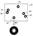 現実の対象画像においては数百のビーズが写っているが、この例の対象画像501においては説明を簡単にするために、502〜507の6個のビーズが写っているものとする。図3の紙面下部に1つのビーズを拡大したものを示しているが、ビーズは中央部に非常に明るい領域を持っている。これは、ビーズが半透明なアクリルでてきているため、背景から光を当てた場合には、レンズの働きを示し、中央部分に集光して中央が非常に明るくなるからである。また、ビーズ周縁部分は光が曲げられて届かないため、非常に暗いものとなる。  In the actual target image, several hundred beads are shown, but in the