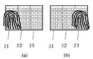 つづいて、指紋照合部27は、分岐部25から出力された信号をスルーして、それらをメモリ26に登録する。なお、ユーザの指がたとえば図6(a)に示すように領域21,22にしか接触していない場合や、図6(b)に示すように領域22,23にしか接触していない場合などには、表示部6に「指紋センサの中央部に指を移動させてください」という旨を表示して、指紋照合の際に用いる量を増やして、指紋照合の確実性を担保するようにしている。