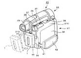 図5及び図6に示すように、外装ケース21の背面には、携帯用電源であるバッテリー装置1が着脱可能に装着されるバッテリー収納部である装着部44が設けられている。装着部44は、外装ケース21の背面の略中央より下側に配置されており、外装ケース21の背面を構成するリアパネル21Dにおいて後方へ開口するように設けられている。リアパネル21Dの右側には、駆動装置側パネル21Aが設けられている。そして、この駆動装置側パネル21Aには、録画ボタン39が配置されている。また、リアパネル21Dの左側には、表示装置側パネル21Bが設けられている。そして、この表示装置側パネル21Bにはフラッシュ装置の発光ボタン46とナイトショットの切換スイッチ47が配置されている。  As shown in FIGS. 5 and 6, a mounting