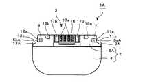 下ケース5の開口部14に装着される出力端子3は、図1及び図3Aに示すように、下ケース5の正面部5bと同一平面となる正面部16aと、この正面部16aと略垂直をなすと共に下ケース5の下面部5aと同一平面となる下面部16bを少なくとも有するブロック状の端子ホルダ16を有している。この端子ホルダ16には、内部に電極が配置された複数(本実施例では4つ)の電極用スリット17a,17aと、これら複数の電極用スリット17aの両側に配置された2つの位置決め用スリット17b,17bが設けられている。この電極用スリット17a及び位置決め用スリット17bは、端子ホルダ16の角部において正面部から底面にかけて連続する溝状の切込みとして形成されている。  As shown in FIGS. 1 and 3A, the