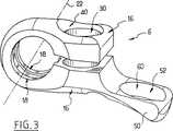 分岐部16にはそれぞれ、平滑な2つの円筒状開口があり、これらの開口は、この場合、互いに同軸に反対方向へ延びている貫通オリフィス30である。主ねじ8は、二重皮質性脊椎骨ねじであり、それ自体、知られた方法で、この目的のためにねじが切られた本体がある。主ねじ8には頭部32があり、頭部32には平滑な円筒状外面34がある。このねじには、頭部と本体との接続点に、環状のフランジ部36が含まれている。フランジ部36には、このねじの長手軸に垂直な下面と、このねじの頭部32に向かって位置する円錐台の最も狭い断面を有する円錐台状の上面38とがある。頭部32には、このねじの本体に同軸であるねじ付きオリフィス39があり、また、オリフィス39のねじ面には、六角ソケットなどの非環状形状が形成されている。締付用ねじ10には、このオリフィス39とねじ−ナット連結を形成することのできる、ねじの切られた本体42と、六角ソケットが形成されたねじ頭部44とが含まれている。頭部44には、球状かつ凸状の下部外面46があり、この外面の最も狭い断面はそのねじの先端に向かって位置している。