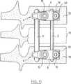 このような装置は、図8に示すように、次のような方法で取り付けられる。傷んだ脊椎骨70とそれに隣接する2つの脊椎骨72とをむき出しにした後に、これらの脊椎骨のそれぞれの平板部をできれば存続させるのであるが、一方では脊椎切除が行われる。それぞれの半組立体について、関連した脊椎骨72の側方側面には、上方平板部および下方平板部から等距離の箇所に、かつ、脊椎骨本体における最後方4分体の限界位置に、案内穴が作られる。次に、この案内穴の中に主ねじ8が限界フランジ部36まで挿入される。その後、連結具6が、主ねじ8の上に配置され、連結具6の凹所40に合致している主ねじ8の円錐面38によって連結具6の移動が阻止される。次に、最前方部分である下方分岐部16を曲げるために、脊椎骨への連結具6の嵌合状態が点検され、連結具6を引き上げることで調節することができる。