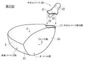 なお、このスカート部21は、下縁近傍における一部(周方向の一部)が外方に向って膨出した形状の突部Eとなっており、ウェイト材24はこの突部Eに結合されている。  The