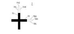 本発明の第5の実施形態に係る三次元形状造形物の製造方法における光ビームの照射位置の補正について図面を参照して説明する。図10は、補正用マーク7の形状を示す。本実施形態においては、補正用マーク7を十字形状にしており、補正用マーク7の位置は、次のように計測する。補正用マーク7は縦線71と横線72から成っている。縦線71と横線72の線幅は撮像カメラ5の視野に収まる太さとし、概ね視野の半分以下にすることが望ましい。半分以下にすることにより、視野が多少ずれても補正用マーク7の位置を計測することができる。まず、補正用マーク7の縦線71の左側の境界線71Lと右側の境界線71Rを求め、2つの境界線の中間線71Cを算出する。同様に横線72の上側の境界線72Uと下側の境界線72Lを求め、2つの境界線の中間線72Cを算出する。2つの中間線71C及び72Cから交点の座標を算出し、補正用マーク7の位置とする。このように、補正用マーク7が十字形状であるので、縦線と横線が交差する座標を容易に求めることができる。(Fifth embodiment)