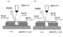 本実施形態においては、造形用プレート23の上に補正用プレート(プレート)41を載置し、その補正用プレート41の上に補正用ターゲット4を載置している。補正用プレート41は、補正用ターゲット4の補正用マーク7に対応する箇所が空洞となっている。空洞は貫通していない座ぐり穴41aでもよいし、貫通穴41bでもよい。図6(a)及び(b)の例では、補正用プレート41に9箇所の座ぐり穴41a、又は貫通穴41bが開けられ、その座ぐり穴41a、及び貫通穴41bの上の位置で補正用ターゲット4に補正用マーク7が付与されている。この補正用マーク7を撮像すると、補正用マーク7の下が空洞となっているので、補正用マーク7の部分が暗くなり、補正用マーク7とその周囲とのコントラストが明瞭になる。  In the present embodiment, a correction plate (plate) 41 is placed on the