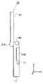 図4は図1に示す下側ハウジングのA−A’断面図であり、図5は、図1に示す上側ハウジングのB−B’断面図である。図4に示すように、下側ハウジング11の内側面(撮像装置10が閉状態となった場合に内側となる面)上には、当該内側面に垂直な方向に突起するように設けられる軸部11Aが設けられる(軸部11Aは下側ハウジングと構造的に一体になっている)。軸部11Aは、左右方向(図示y方向)に関して両端の位置に設けられる(図1参照)。なお、軸部11Aは、図15に示すように、左右方向に関して両端からやや内側の位置に設けられてもよい。また、図5に示すように、上側ハウジング21の下側面(図示x軸負側の側面)には、下側面に垂直な方向に対して突起するように設けられる軸部21Aが設けられる(軸部21Aは上側ハウジングと構造的に一体になっている)。軸部21Aは、下側面に垂直な方向に突起するとともに、上側ハウジング21の内側面(撮像装置10が閉状態となった場合に内側となる面)に垂直な方向についても突起するように設けられる。軸部21Aは、左右方向に関して上側ハウジング21の下端中央に設けられる(図1参照)。軸部11Aと軸部21Aとは内部に設けられるヒンジによって回転可能に接続されて一体の突起部を形成する。以上のように構成されることによって、突起部は各ハウジング11および21の内側面に対して突起した状態となる(図2参照)。また、軸部11Aが下側ハウジング11の内側面に対して突起して設けられ、軸部21Aが上側ハウジング21の下方に突起して設けられるので、2つのハウジング11および21が接続された状態では、下側ハウジング11の外側面(撮像装置10が閉状態となった場合に外側となる面)と上側ハウジング21の外側面との間には、下側ハウジング11の厚さの分だけ段差がつけられる(図2参照)。  4 is a cross-sectional view taken along the line A-A ′ of the lower housing shown in FIG. 1, and FIG. 5 is a cross-sectional view taken along the line B-B ′ of the upper housing shown in FIG. 1. As shown in FIG. 4, the shaft provided on the inner side surface of the lower housing 11 (the surface that becomes the inner side when the