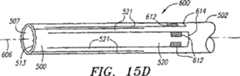 図15Cを参照すると、一対の第2のスロット608が近接する第1のスロット間に設けられている。これは、チューブ600の端部601に全体的に延在することなく軸606にほぼ平行に延在している。第2のスロット608の端部は、周辺スロット610に連結されており、これによって支持アーム520を規定している。従って、各スプライン520は、一対の狭いステム511によって規定され、各支持部材520の各々の側において、筒状シャフト502から自由端510cまで延在する。支持アーム520は、図に示すように、スプライン510より長くして、スプライン510に比してより大きなフレキシビリティを与えるようにしても良い。また、代替として、支持アーム520はスプライン510と同じ長さか、あるいはスプライン510より短くても良い。当業者は、スプライン510と、支持アーム520に関連する幅及び長さを容易に決定して、所望の延在を提供し、開閉を容易にすることができる。  Referring to FIG. 15C, a pair of