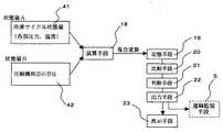 次に、本発明の一例の機器である圧縮機の異常判定の動作について図4の制御ブロック図および図2に基き説明を行う。状態量Aすなわち冷凍サイクルの状態量41は、冷凍サイクルの運転状態を把握するために必要な冷媒回路を流れる冷媒の各部圧力、温度の状態量、あるいは圧縮機電流値、消費電力などの駆動力などであり、図2の冷媒状態量測定手段16にて状態量としての数値の測定が行なわれる。なお、冷凍サイクルの運転状態を把握するためには、図2において、圧縮機11の吐出側から膨張弁13に至る流路のいずれかの位置における冷媒の圧力すなわち高圧、高圧の飽和温度すなわち凝縮温度、圧縮機11の吐出側から凝縮器12に至るいずれかの位置の冷媒温度すなわち吐出温度のうちの少なくとも1つの状態量か、あるいは、膨張弁13から圧縮機11の吸入側に至る流路のいずれかの位置の冷媒圧力すなわち低圧、低圧の飽和温度すなわち蒸発温度、圧縮機11の吸入側から蒸発器14へ至る流路のいずれかの位置の冷媒温度すなわち吸入温度のうちの少なくとも1つの状態量の少なくともどちらかを測定すればよい。なお、冷温水を熱源とするチラーなどにおいて年間を通して熱源温度にほとんど変動がない場合には、影響を無視するか、高圧側もしくは低圧側の条件にほとんど変動がないため、変動が少ない状態量については計測を行わず固定入力値として扱うので1つの状態量測定で良いが、もし固定入力として扱うことが難しければ両方の状態量を測定すれば良い。圧力の測定は冷媒の圧力を電気信号へ変換する圧力変換器などを用いて行い、温度の測定はサーミスタ、熱電対などの温度検出手段を用いる。なお、圧力、温度測定位置については、対象とする冷凍サイクルの構成、動作特性に合わせて、位置の変更、測定位置の増設を行い、より的確に冷凍サイクル運転状態を把握するように構成してもよい。状態量Aの測定は、ある一定間隔例えば1分間隔などで測定が行われ、演算手段17へ情報伝達される。なお現地で簡易的な異常判定を行う場合などでは、状態量Aを機器付属の圧力メータ、温度計などから読み取り手入力で入力しても構わない。又高圧や低圧などの状態量の中にはほとんど値が変動しないものがあるような装置、機器では圧力や温度などの変動しない状態量を固定値としてあらかじめ設定しておくか測定値とは別に手入力とし、これらの数値と測定値を組み合わせる形としても構わない。すなわち冷媒状態量測定手段が測定する状態量の代わりに、あらかじめ設定された数値あるいは機器の運転状態から読み取りもしくは推測された数値を使用することも可能である。駆動トルクや電流を計測することについては後で説明する。  Next, the abnormality determination operation of the compressor which is an example of the present invention will be described based on the control block diagram of FIG. 4 and FIG. The state quantity A, that is, the