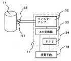 図15は第一の脈動状態量検出手段51および第二の脈動状態量検出手段52の詳細を表した図であり、圧縮機11近傍の振動および音圧を検出するシステム構成を表したものである。51の第一の脈動状態量検出手段は例えばマイクなどの音圧を電気信号に変換する手段、52の第二の脈動状態量検出手段は例えば加速度ピックアップもしくは変位センサーなどの振動状態量を電気信号に変換する手段、32はフィルタ−およびアンプ、33はA/D変換器、34はFFT演算器を表す。本例では音圧と振動を同時に検出しているがその検出手法は図3のものに同じであり、本例では2ch対応となっている点が異なる。  FIG. 15 is a diagram showing details of the first pulsation state quantity detection means 51 and the second pulsation state quantity detection means 52, and shows a system configuration for detecting vibration and sound pressure in the vicinity of the