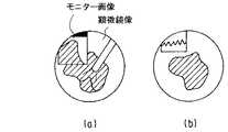 内視鏡6で得られた像は、  TVカメラ7およびCCU8により映像信号となり、ミキサ23を介してモニタ20に映し出される。モニタ20の画像は、レンズ19によりミラー18およびプリズム24を介して、結像面16に結像する。この時の接眼レンズ14による観察像が図5の(a)に示されている。図示のように、結像レンズ9によって結像面16上に結像した顕微鏡像は、プリズム17の反射面25に施されたミラーコートによって遮られる。一方、モニタ20の画像はプリズム17によって顕微鏡像と同一の結像面16に結像するため、観察者は顕微鏡像とモニタ画像とを同時に観察できる。なお、この場合、結像面16の近傍にプリズム17の出射面24が配置されているため、プリズム17の出射面24自体が顕微鏡像とモニタ画像との境界となる。