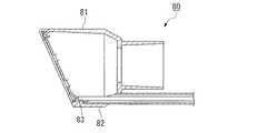 第4の実施形態と第1の実施形態との異なる点は、第1の実施形態ではキャップ部11が略円筒形状であるのに対して、第4の実施形態における内視鏡用フード80では、図8及び図9に示されるように、キャップ部81が外壁から突出し先端に向かって延在する突条部82を有すると共に、内面に突条部82に対応した溝部83が形成され、溝部83に軟性チューブ16の先端側が配されている点である。  The difference between the fourth embodiment and the first embodiment is that the