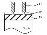 しかしながら、ウエハとして上記のSOIウエハを用いた場合、すなわち、埋め込み酸化物層上の単結晶シリコン層にプラズマエッチングを施してフィン状の突起部を形成し、この突起部に生じたダメージを、犠牲酸化膜のウエットエッチングにより除去する場合には、図2に示すように、形成されるフィン51の基端部分にくびれ(オーバーハング)52が生じてしまう。  However, when the above-described SOI wafer is used as a wafer, that is, the single crystal silicon layer on the buried oxide layer is subjected to plasma etching to form a fin-like protrusion, and the damage caused to the protrusion is sacrificed. When the oxide film is removed by wet etching, as shown in FIG. 2, a constriction (overhang) 52 occurs at the base end portion of the