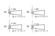 即ち、図1の(A)の導光ロッド10において、ロッドの取込効率向上のため、LED1のチップを該ロッドに近づければ取込効率が上がるが、被照射領域外の光になるか、許容NAを超えた光になるかで結局無駄な光になってしまうので、本第2の実施の形態では、テーパー状の導光ロッドであるテーパーロッド13を用い、該テーパーロッド13においてNA変換を行い、効率向上を図るようにしている。